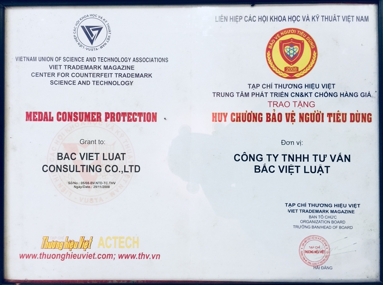 On 29/11/2008 at the building of National Assembly- Ho Chi Minh city, Law Office- Bac Viet Luat was honoured to receive a medal for protecting consumers by Viet